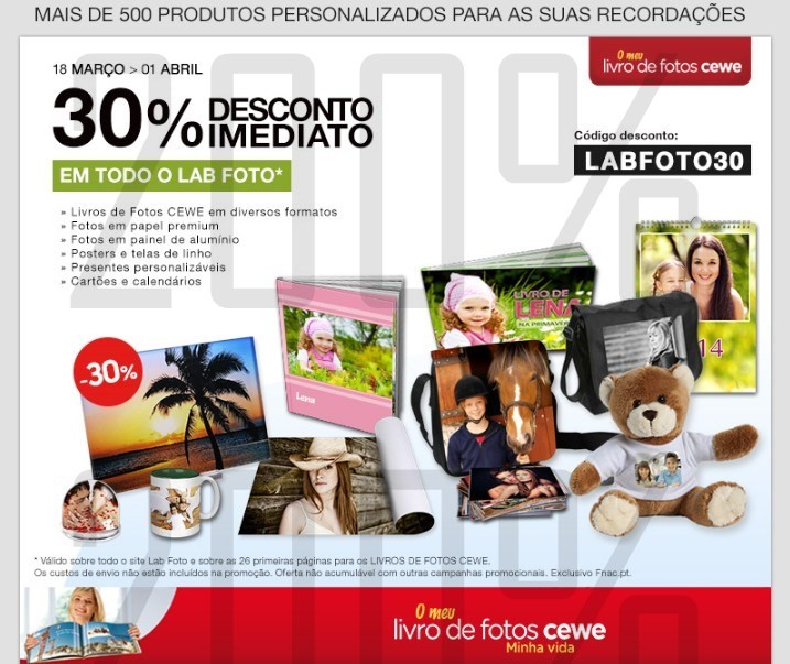 30% de desconto | FNAC | Foto Lab até 1 abril, introduza o codigo de desconto LABFOTO30 ,